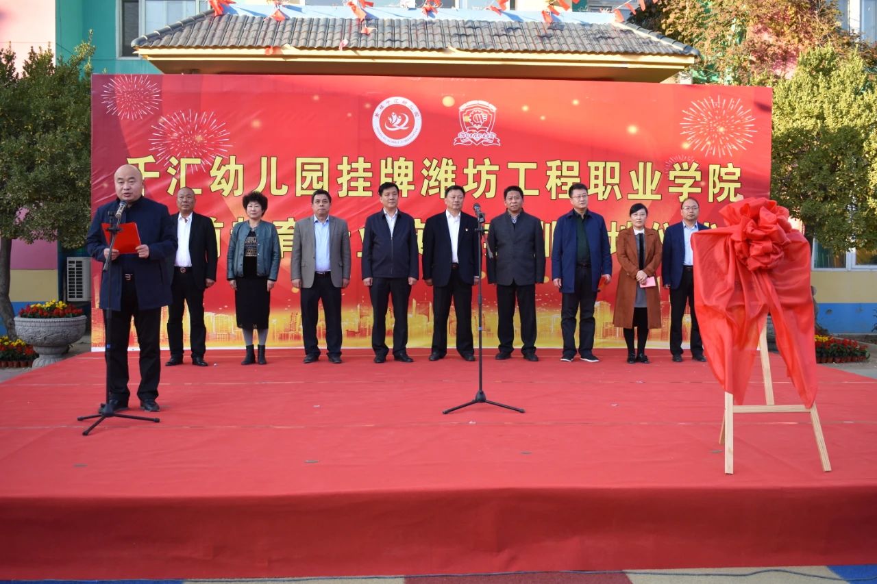 仪式上,郝炎磊对千汇幼儿园挂牌表示祝贺,对我院对当地学前教育的支持表示感谢。教师教育学院负责同志简要介绍了我院的基本情况,并表示今后将从教师培训、学生实习、教科研等方面进行深入交流,为推动区域教育发展做出积极贡献。肖明胜和庞德贞为潍坊工程职业学院幼师实习基地揭牌。
