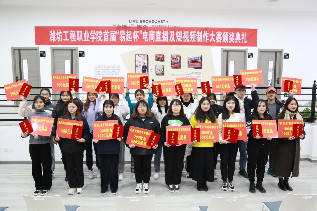 近日,首届“易起杯”电商直播与短视频大赛颁奖典礼在潍坊乡村电商学院举行。副院长王守庆出席仪式并致辞,青州市商务局副局长高辉、市扶贫办副主任刘传华、市农业农村局副局长王磊、青州市坦博尔服饰股份有限公司常务副总经理侯增江、青州易起网络科技有限公司董事长时强等出席典礼,学院经济管理系、团委学生处相关负责人及师生代表、企业来宾参加了典礼活动。
