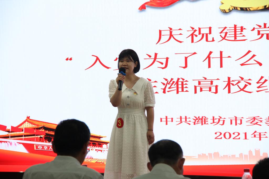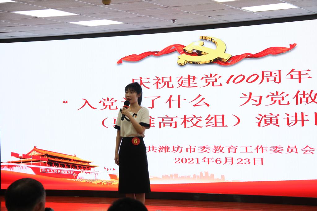 6月23日,由中共潍坊市委教育工委组织举办的潍坊市教育系统“入党为了什么,为党做了什么”主题演讲比赛在山东信息职业技术学院举行。我院会计与统计学院教师沙青、教师教育学院学生赵玮宁分别代表学校参加教师组、学生组比赛,荣获二等奖。
