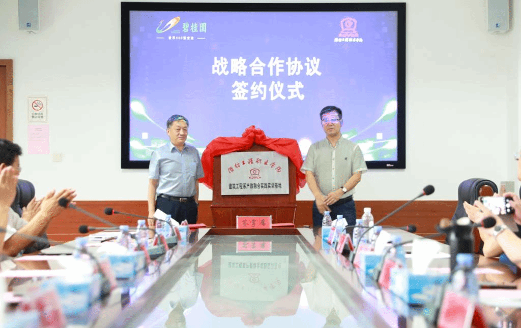 7月8日,潍坊工程职业学院院与碧桂园集团在青州签署战略合作协议,双方将共同推动智能建造、绿色建造、建筑机器人技术研发与应用、人才培养等领域的全面合作,将“工地”搬进课堂,让实践与理论创新结合,强强联手开启校企合作新篇章。