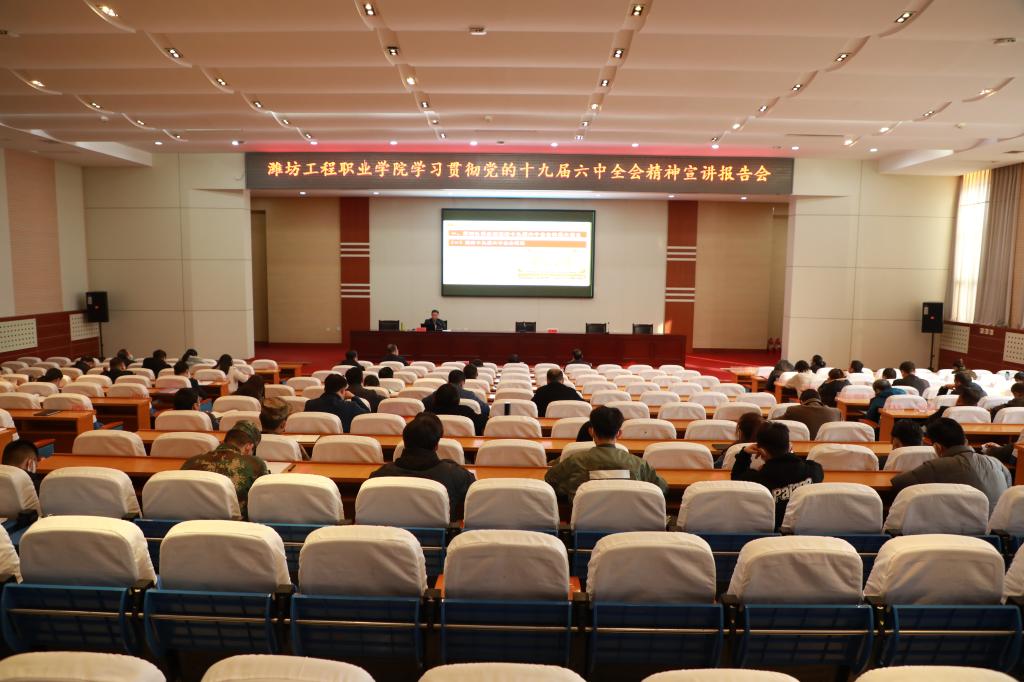 12月9日下午,我院在学术报告厅举行党的十九届六中全会精神宣讲报告会。学院部分领导班子成员出席会议,潍坊市高校党组织书记宣讲团成员、学院基础教学部主任刘万韬宣讲党的十九届六中全会精神,学院副科级及以上干部和各院系学生会主席参加会议。