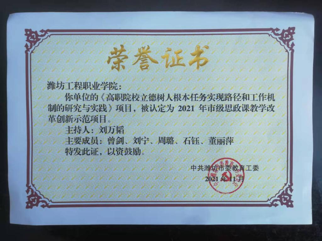 近日,潍坊市委教育工委公布了2021年市级思政课教学改革创新示范项目名单,我院基础教学部刘万韬、曾剑老师主持的《高职院校立德树人根本任务实现路径和工作机制的研究与实践》入选市级思政课教学改革创新示范项目。