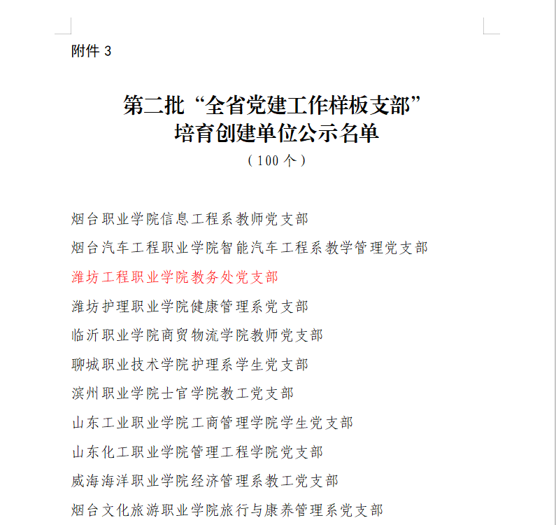 近日中共山东省委教育工委公布第二批山东党建工作示范高校、标杆院系、样板支部培育创建单位名单,我院教务处党支部获批山东党建工作样板支部培育创建单位。