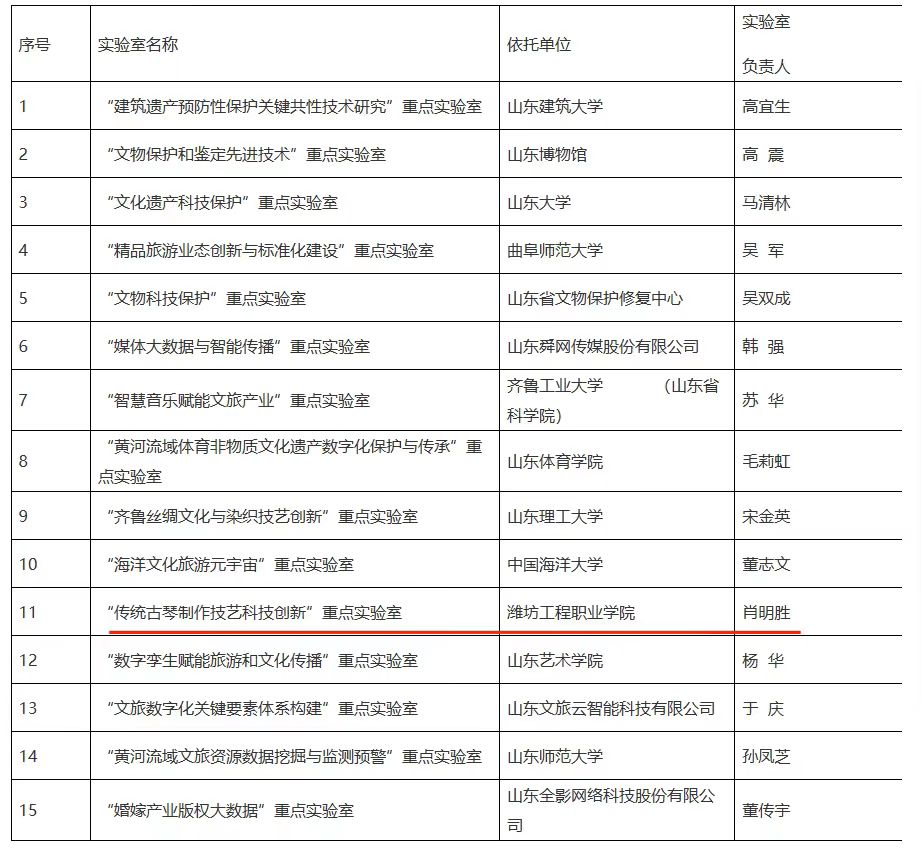 近日,山东省文化和旅游厅对全省15所文化和旅游重点实验室进行了公示,我院“传统古琴制作技艺科技创新”重点实验室成功入选,是唯一入选的职业院校,填补了我院在省重点实验室项目上的空白。