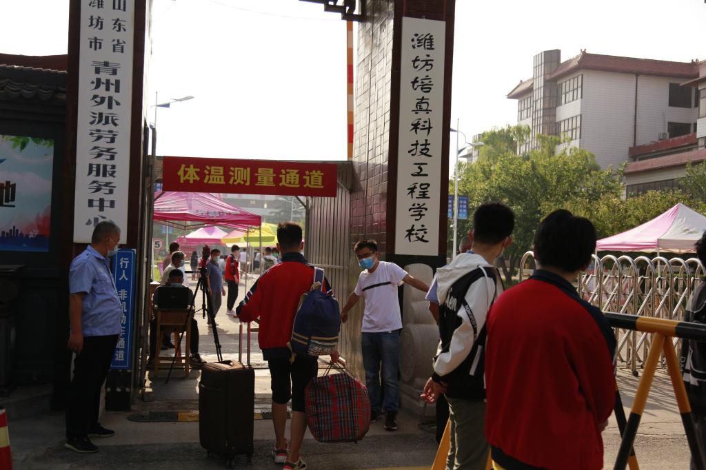 为减轻学生集中入校压力,学校安排学生分上、下午两批分时段错峰入校。住校学生上午分时段错封入校,走读生下午入校,整个报到过程井然有序。在青州交警帮助下,学校大门口南北路实行交通管制,学校只允许学生自己携带行李进入。