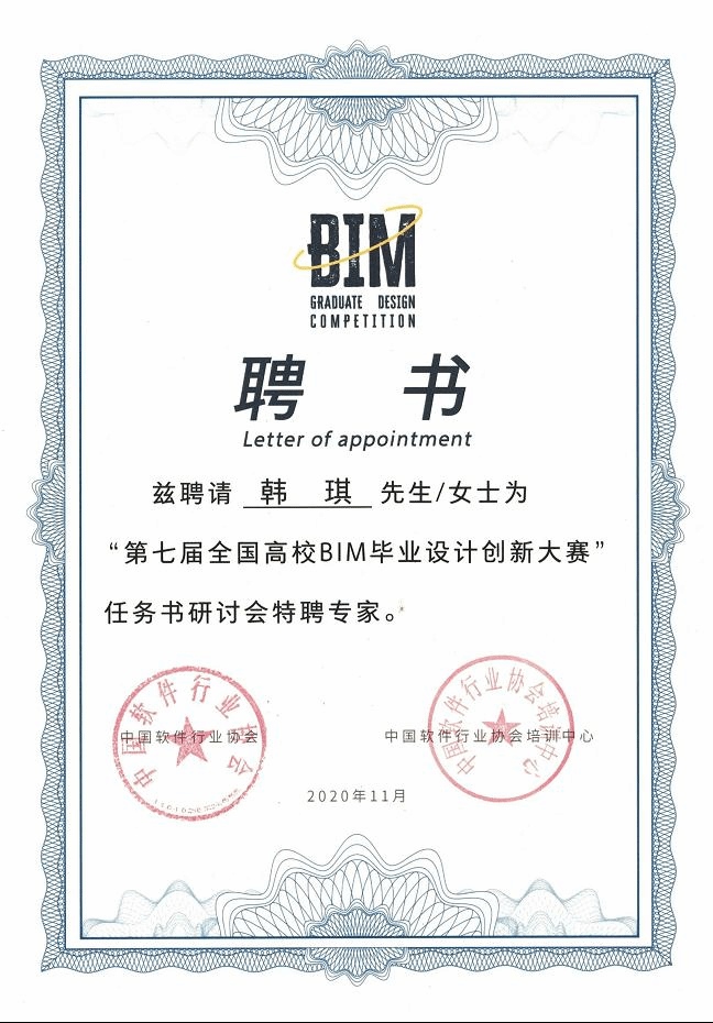 11月14-15日,由中国软件行业协会召集,广联达科技股份有限公司举办的“第七届全国高校BIM毕业设计创新大赛”和基于课证融通的BIM课程建设专家研讨会在北京举行,会上我院建筑工程系教师韩琪受聘为中国软件行业协会专家,并同本科、高职、企业等专家代表一同参加了此次高层研讨。