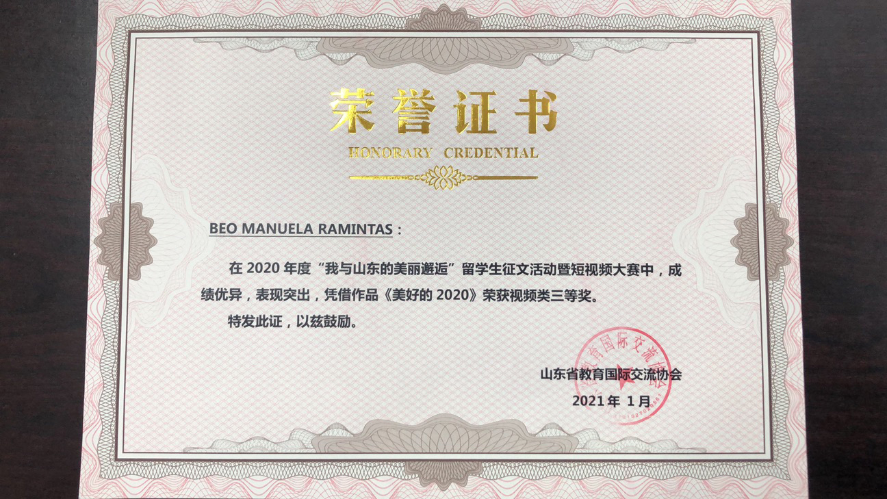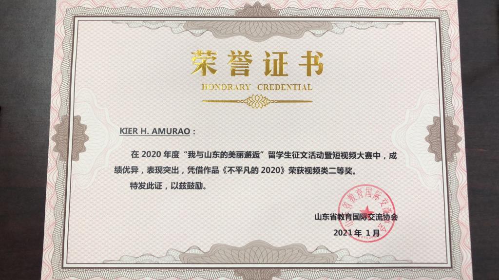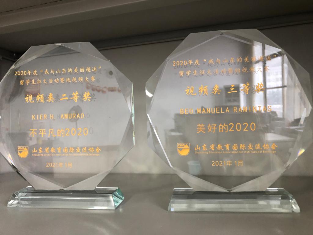 近日,在山东省教育国际交流协会组织的驻鲁高校首届“我与山东的美丽邂逅”征文暨视频大赛评选活动中,我院蔺莉莉老师指导的两名留学生分获视频类二、三等奖各1项。其中留学生杨洋拍摄的短视频《不平凡的2020》喜获二等奖,在所有参赛的高职院校中位列第一名。