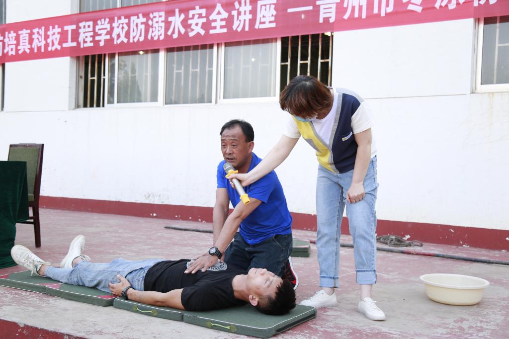 讲座中,潍坊市冬泳协会青州分会会长那凤铎用生动的案例向中专部师生讲述了青州本地曾发生的溺水事件,让师生明白了溺水的严重危害和防溺水的重要性。曾多次参与救援的冬泳协会专业教练有令国对如何救援溺水者作了生动具体的现场演示,他对溺水自救、心肺复苏等应急救护方法的具体步骤做了讲解。