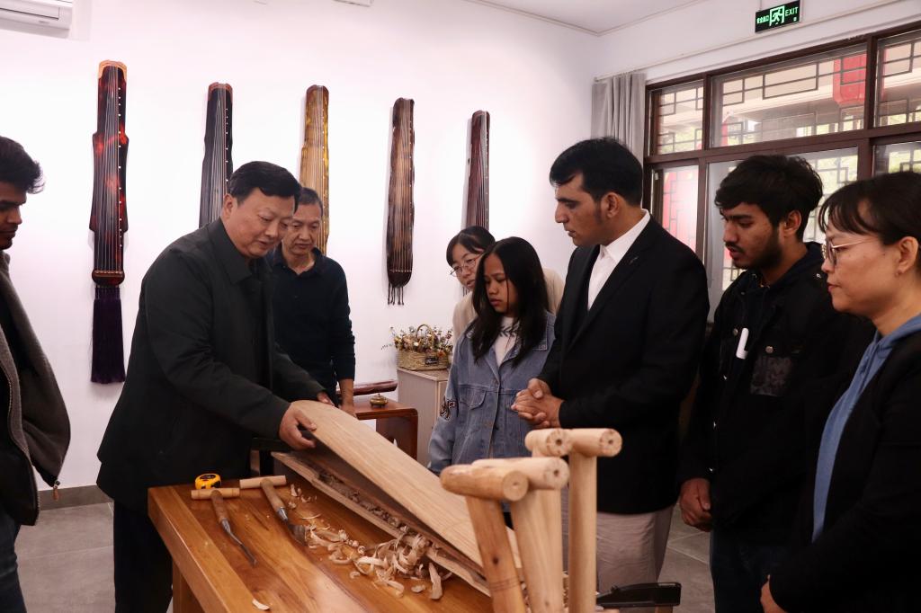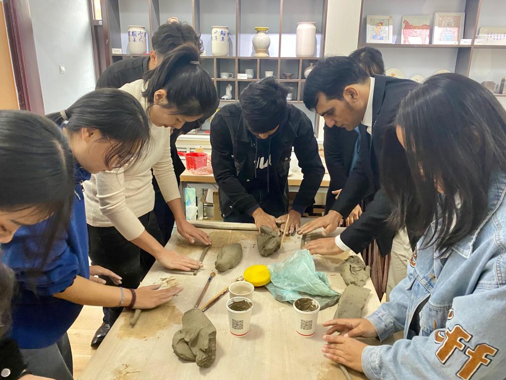 国际学生们先后参观了古琴坊、陶艺坊、风筝坊等“十二工坊”和挫琴、古琴制作、花键、剪纸、烙画、青州府陶艺等非遗传承工作室。国际学生每到一处都驻足观摩,表现出浓厚的兴趣。在斫琴坊,潍坊市古琴制作技艺代表性传承人、学院党委书记肖明胜亲自为国际学生讲解古琴制作技艺,国际学生赞叹不已。在陶艺坊,国际学生饶有兴趣地拿起陶艺专用泥,认真地跟随陶艺老师学习陶艺,不一会儿,一个个栩栩如生的陶艺作品展现在面前。国际学生在动手实践中领略中国传统文化魅力。活动最后,国际学生还接受了山东广播电视台记者采访,面对镜头,他们用汉语表达对中国非遗文化的热爱。
