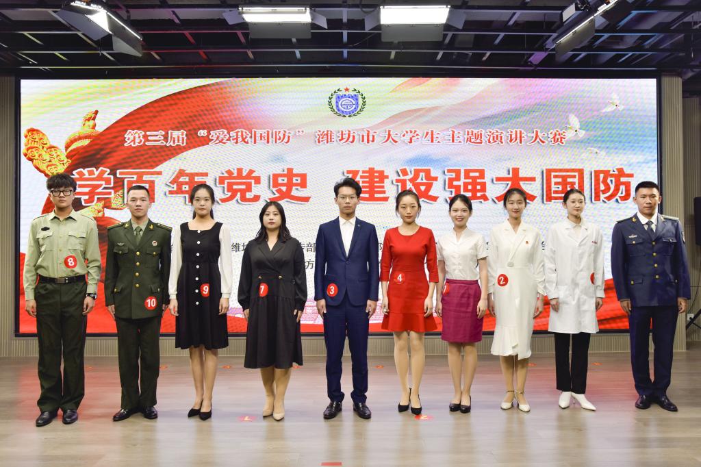 11月6日至7日,由中共潍坊市委宣传部、潍坊市国防教育办公室、潍坊军分区政治工作处、潍坊市教育局、潍坊市文化和旅游局联合主办的第三届“爱我国防”潍坊市大学生主题演讲大赛在潍坊日报社融媒体中心城市发布厅举行。共有来自全市15所高校的32名(组)参赛选手参加了比赛。经过预赛、决赛的激烈角逐,我院校园广播站的王雨阳同学荣获全市第三名,演讲与口才协会的祁颖、靳智豪同学荣获优秀奖。