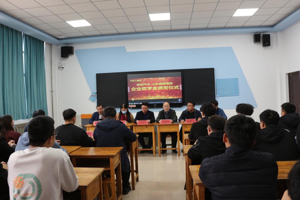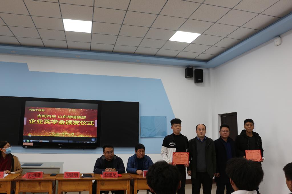 11月19日下午,“吉利.德瑞博汽车企业奖学金”设立暨颁发仪式在汽车工程系举行,山东德瑞博新能源汽车制造有限公司校企合作部主任孙堋菲、市场总监赵建龙、技术总监柳振中,汽车工程系负责同志、教师代表以及全体山东德瑞博校企合作专业学生参加了颁奖活动,2020级校企合作专业的10名同学喜获首届奖学金。