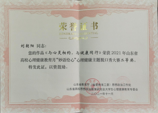 近日,我院学生作品在2021年山东省高校心理健康教育节“妙语绘心”心理健康主题脱口秀大赛中取得优异成绩,荣获二等奖1项、三等奖2项,实现了我院学生首次在高校心理健康节获奖的新突破。