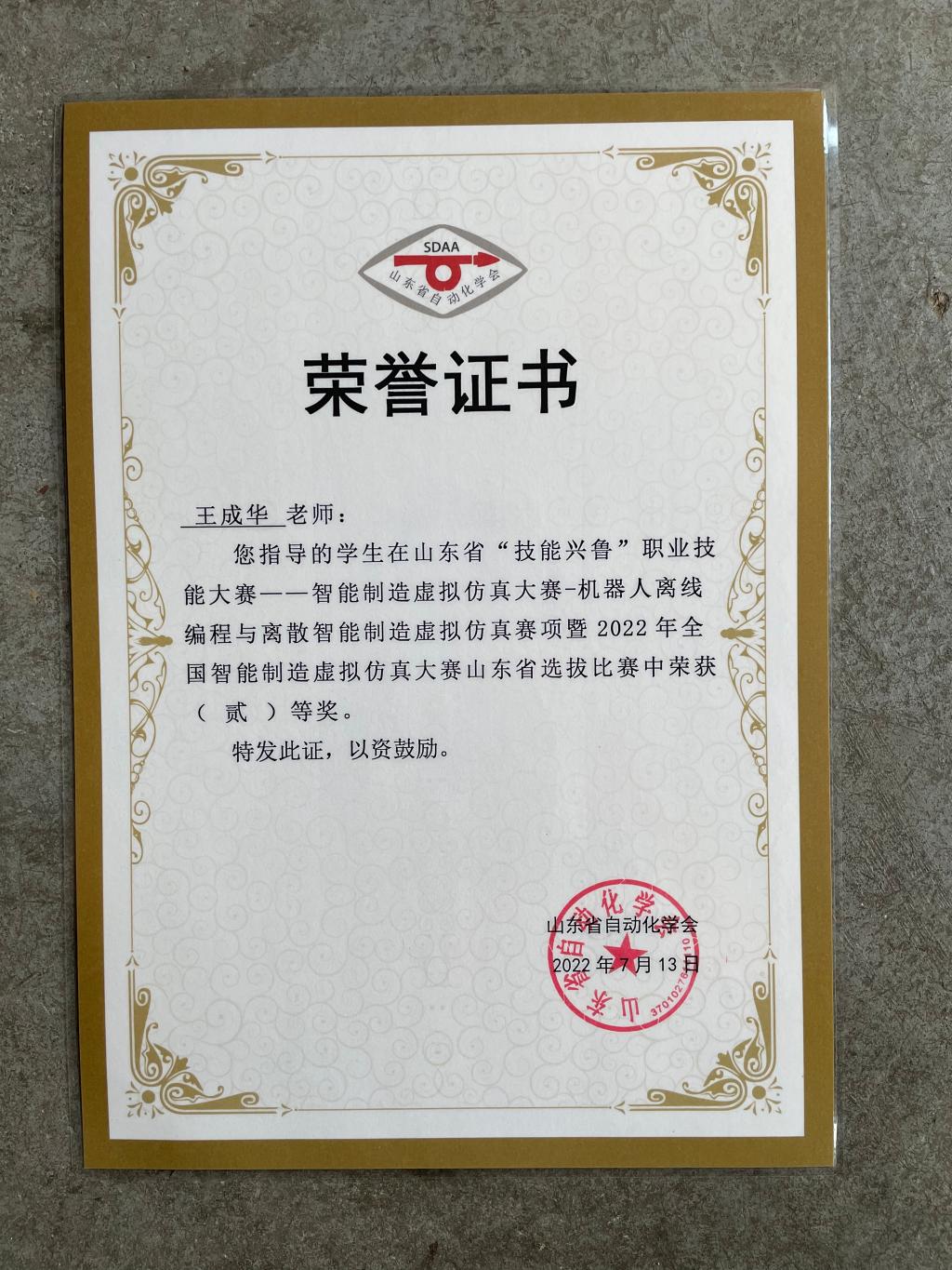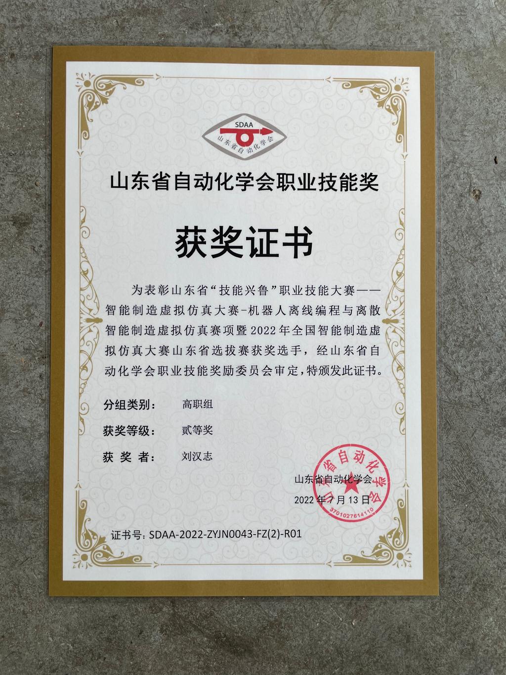 7月12日至13日,山东省“技能兴鲁”职业技能大赛首届智能制造虚拟仿真大赛——机器人离线编程与离散智能制造虚拟仿真赛项暨 2022 年全国智能制造虚拟仿真大赛山东省选拔比赛在济南职业学院举行,我院王成华老师指导的刘汉志荣获二等奖。