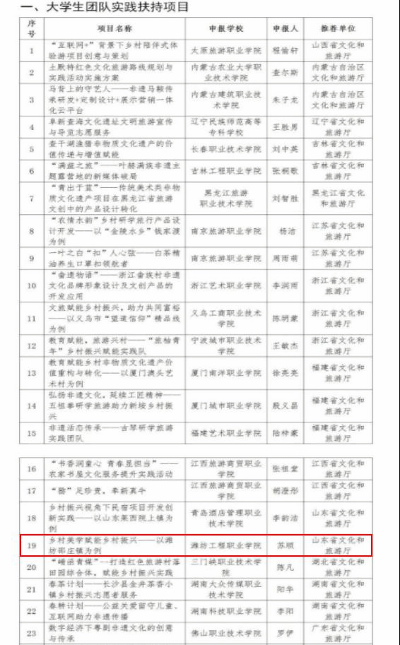 近日,文化和旅游部办公厅公布了《2022年度文化艺术职业教育和旅游职业教育提质培优行动计划拟入选入选项目名单》。其中,我院组织提报的《乡村美学赋能乡村振兴——以潍坊邵庄镇为例》,获批文化和旅游部科技教育司“大学生团队实践扶持项目”,成为我省文化和旅游文化厅推荐入选两个项目之一。