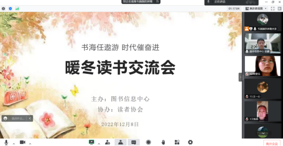 为丰富师生校园文化生活,12月8日,图书信息中心联合读者协会共同举办“书海任遨游,时代催奋进”暖冬读书交流会活动。本次活动采取在线互动交流方式,吸引了广大师生的踊跃参与。活动中,大家结合各自深入品读的作品,畅谈读书心得,分享读书体会,此次分享会上,《平凡的世界》《活着》《红船启航》等著作备受青睐,再次引发了大家的深入思考。本次读书交流活动,为广大读者提供了交流的平台,营造了爱读书、读好书、善读书的浓厚氛围。