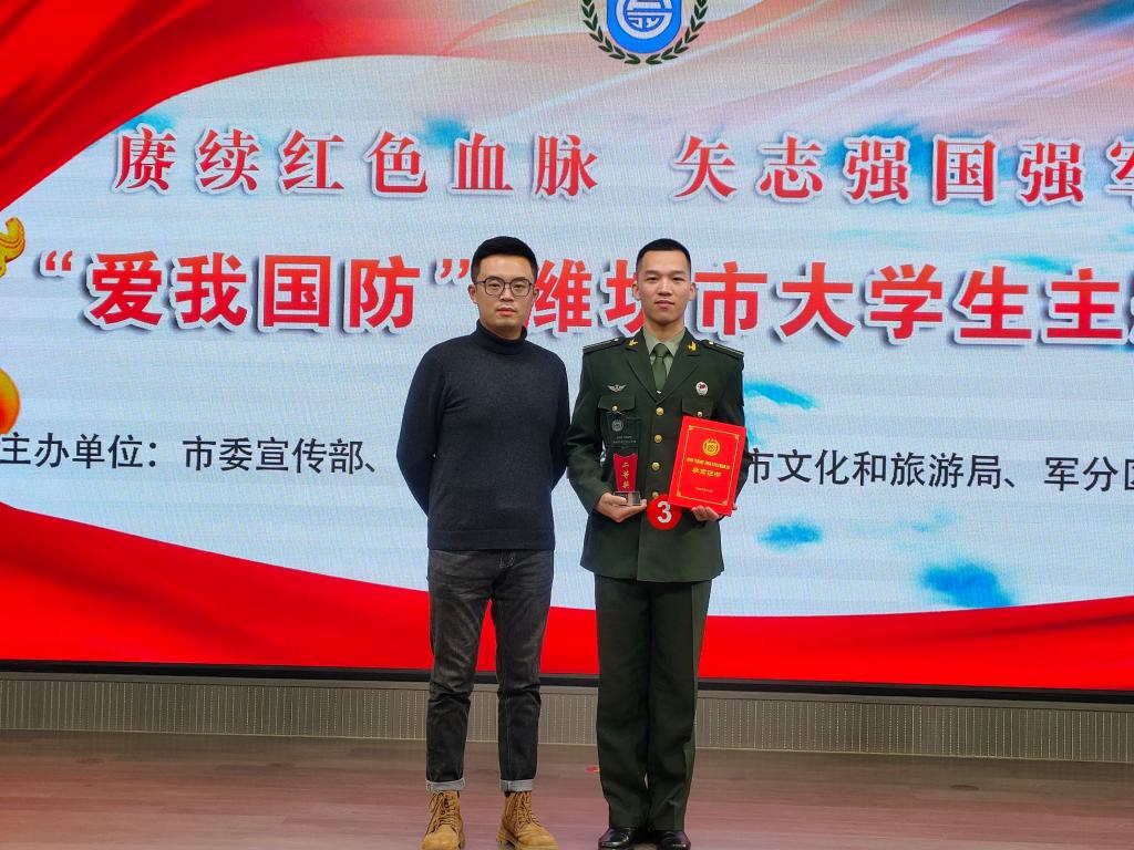 近日,由中共潍坊市委宣传部、共青团潍坊市委、潍坊市教育局、潍坊市文化和旅游局、潍坊军分区政治工作处联合举办的第四届“爱我国防”大学生主题演讲大赛决赛在潍坊日报社融媒体中心城市发布厅举行。比赛中,我院参赛选手围绕“赓续红色血脉,矢志强国强军”的主题,结合自身成长经历,抒发了用青春报效祖国的使命情怀。凭借优秀表现,我院2020级定向培养军士王雨阳凭借《我的荣耀》荣获全市第三名,团委学生处教师杨智胜荣获“优秀指导教师”。